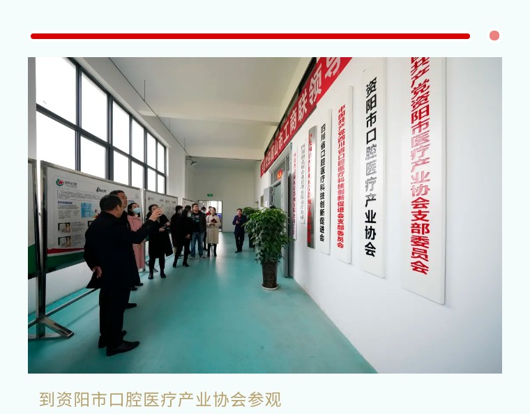 隨后資陽市口腔醫療產業協會會長、黨支部書記李強、副會長王明忠、秘書長杜先瑜在會長單位四川納克斯企業管理有限責任公司迎接眉山市統戰部、工商聯等領導來“中國牙谷”參觀指導工作。
